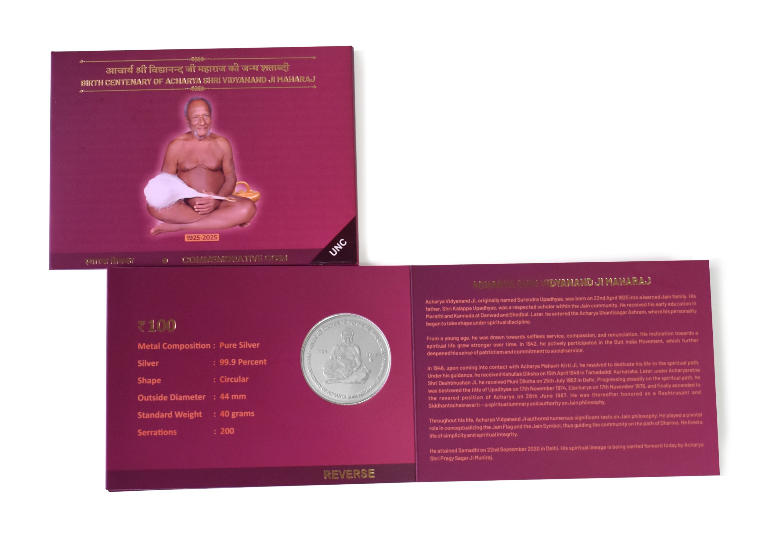 Birth Centenary of Acharya Shri Vidyanand Ji Maharaj | Rs. 100 UNC Coin | 3-Fold Pack
